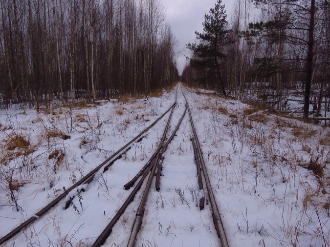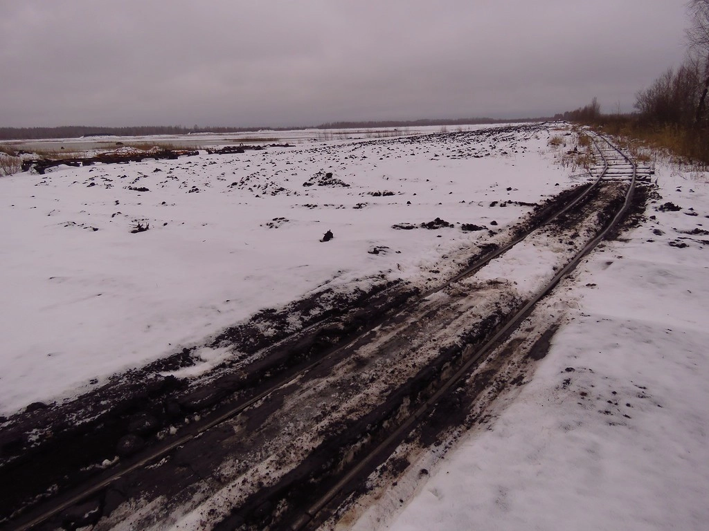 Ветка выше — не основной ход. Это подъездные пути, которые специально прокладывают прямо к торфодобыче от главного хода. Их постоянно собирают-разбирают в разных местах. Для ускорения прокладки тут не используют кривые рельсы, а повороты обеспечиваются засчёт специальных вставок.