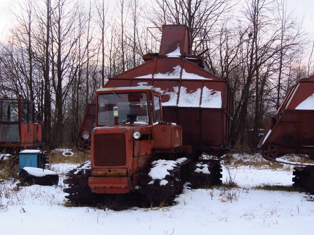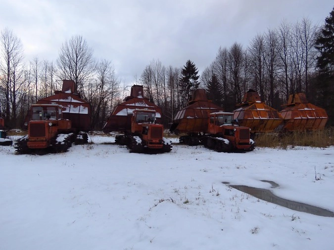 Действующие комбайны, собирающие торф из грунта. Вы не смотрите на их состояние — они все рабочие. И не такие старые, кстати — нулевых годов выпуска. Тогда, о, удивительно, железная дорога процветала.