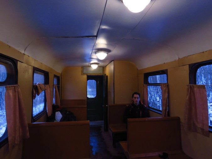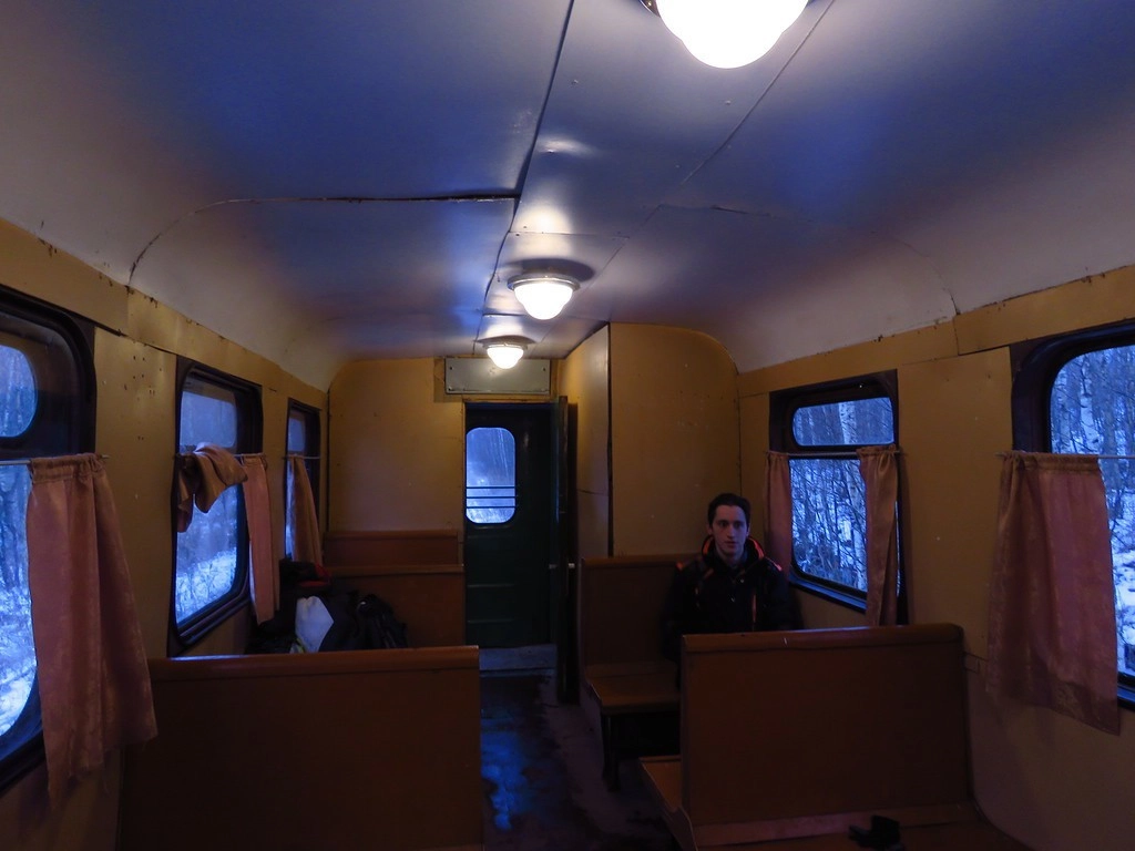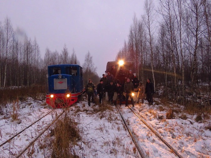На обратном пути в сумерках в тёплом полумраке узкоколейного вагона с печкой-буржуйкой становится сказочно романтично. Обратите внимание на лампы в вагоне. Это подарок Петербургского метрополитена. Музею помогают все кто могут.