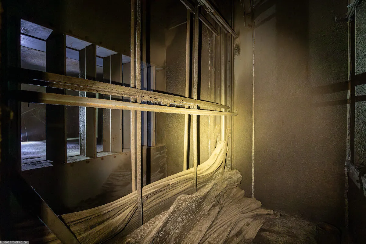 А климатическая установка на объекте № 305 интересна тем, что на ней стояла система очистки от пыли. Видите внизу сложился кусок тонкой металлической сетки? Он просто упал. На самом деле, сетка перекрывала всю площадь сечения канала и вращалась на роликах. Внизу находилась ванна с маслом. Сетка опускалась в ваннночку, пропитывалась маслом и поднималась наверх, улавливая пыль. Потом пыль оседала в низу ванны.