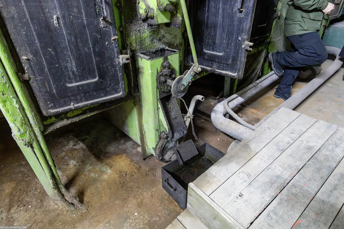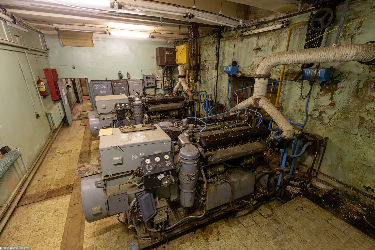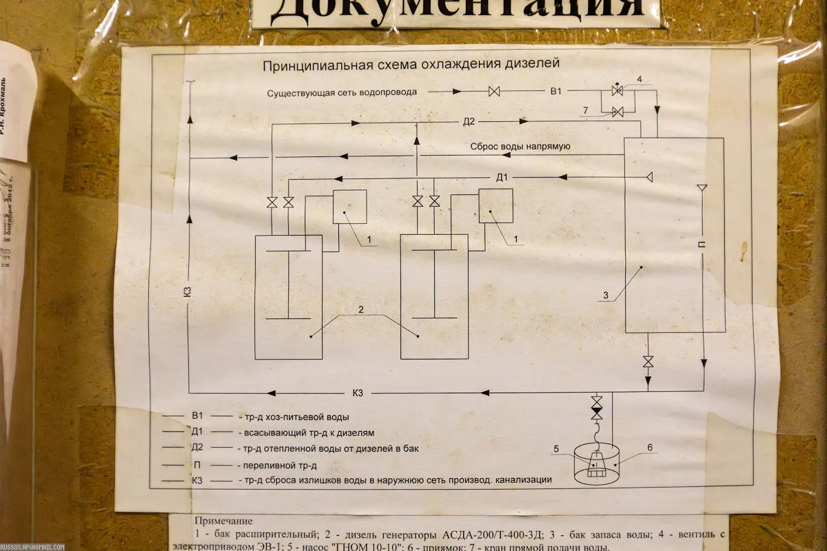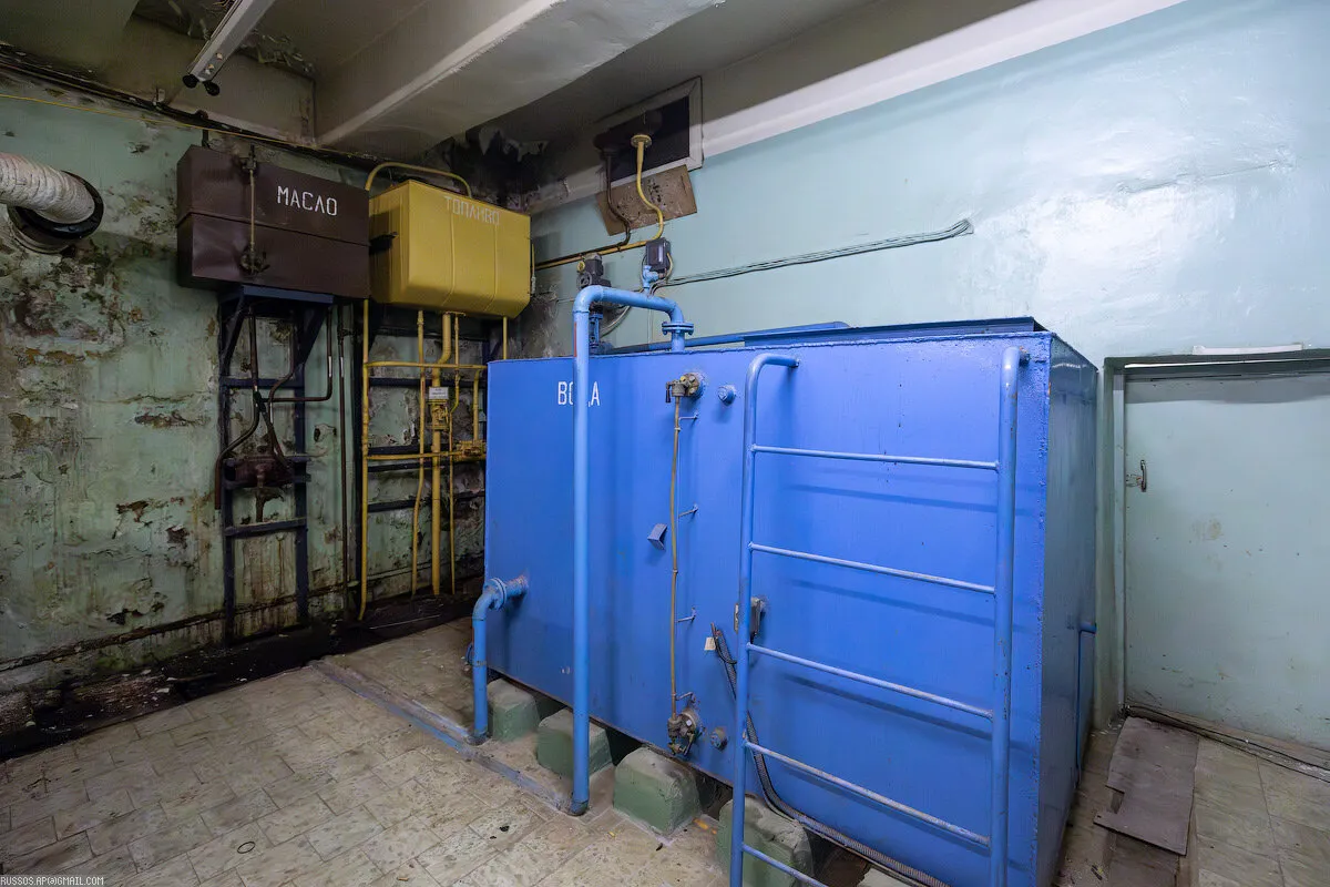 У дизелей водяное охлаждение. Первый контур, который проходит через двигатель, охлаждается водой из этого бака. После нагревания воды в баке, её постепенно заменяют на водопроводную или из артезианской скважины. Слева и сверху два небольших бака — масло и топливо. Маслобак включал весь объем масла — а эти дизели весьма прожорливы. А топливный бак выполнял роль расходного. Основное топливо хранилось в небольшом заглубленной ёмкости на поверхности.