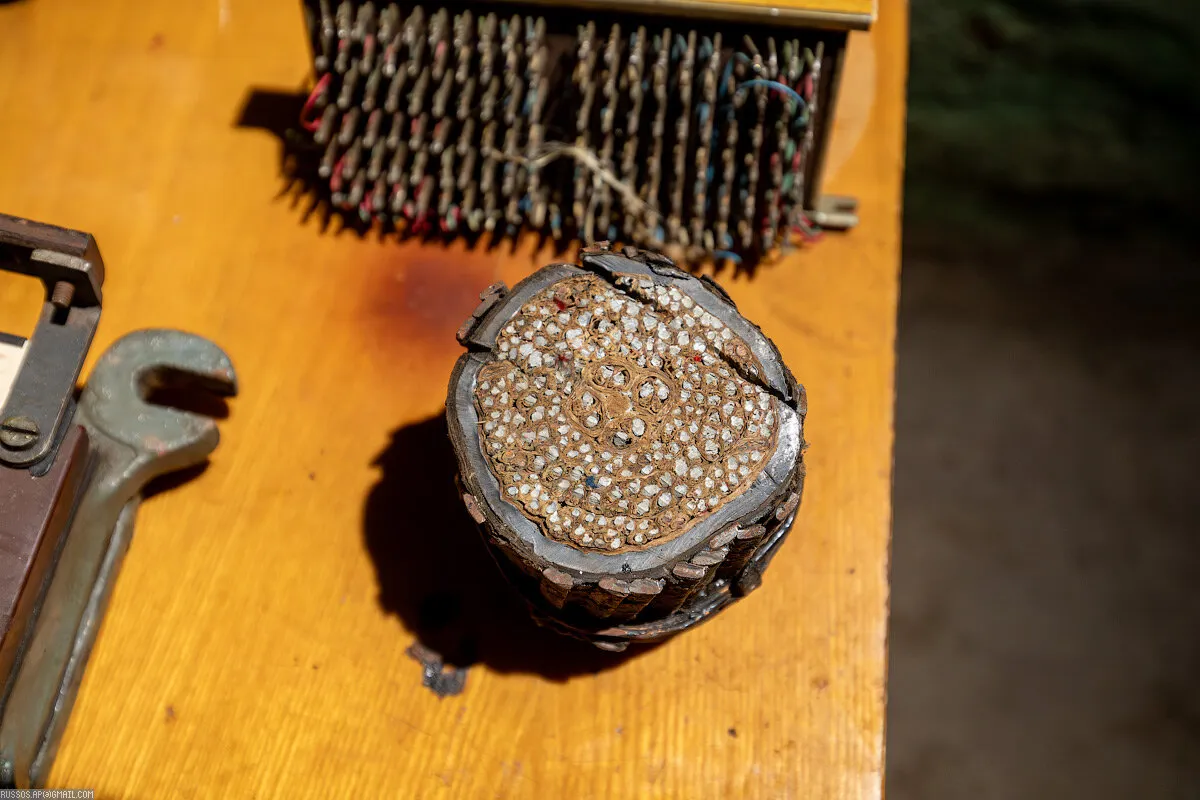 Разрез старого кабеля — алюминиевые жилы и бумажная изоляция. Чтобы такие кабели (кстати, обычно это было самым ценным в системе связи) не портились и не гнили, их помещали в свинцовые оболочки, куда нагнетали сухой воздух, который вытеснял влагу.