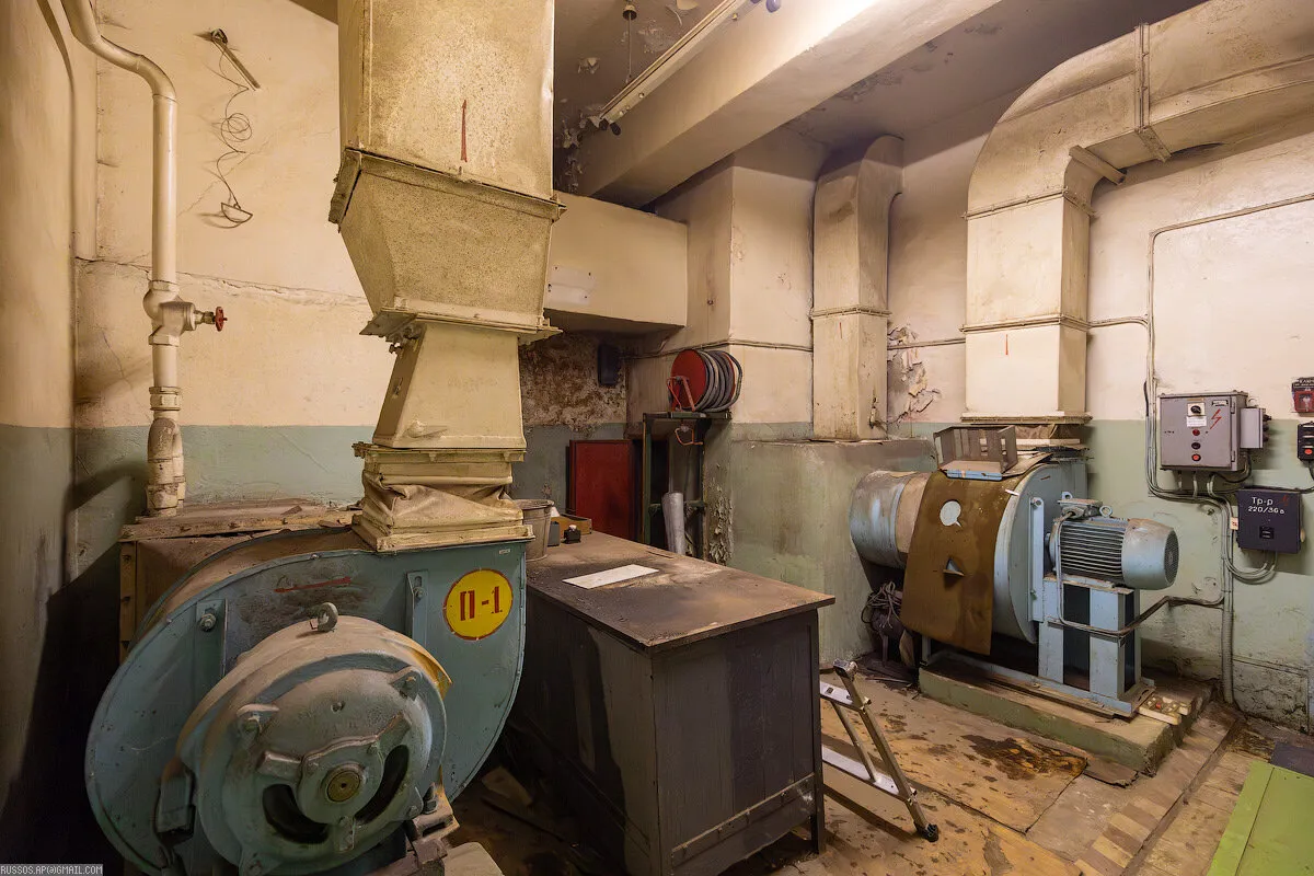 Фильтро-вентиляционная установка объекта. Сюда поступает воздух с поверхности через оголовок вентшахты. В режиме мирного времени он сразу проходит на объект. В режиме военного времени он проходит фильтрование и очищение.