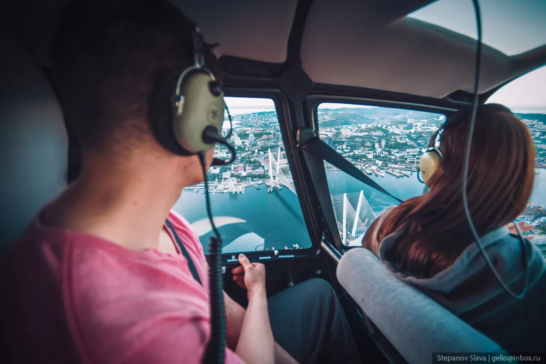 1. Обычно экскурсии тематические — например, центр или мосты Владивостока, остров Русский, Океанариум. Среднее время полёта — 1 час. Для экскурсий используют лёгкие многоцелевые вертолёты Robinson R44.