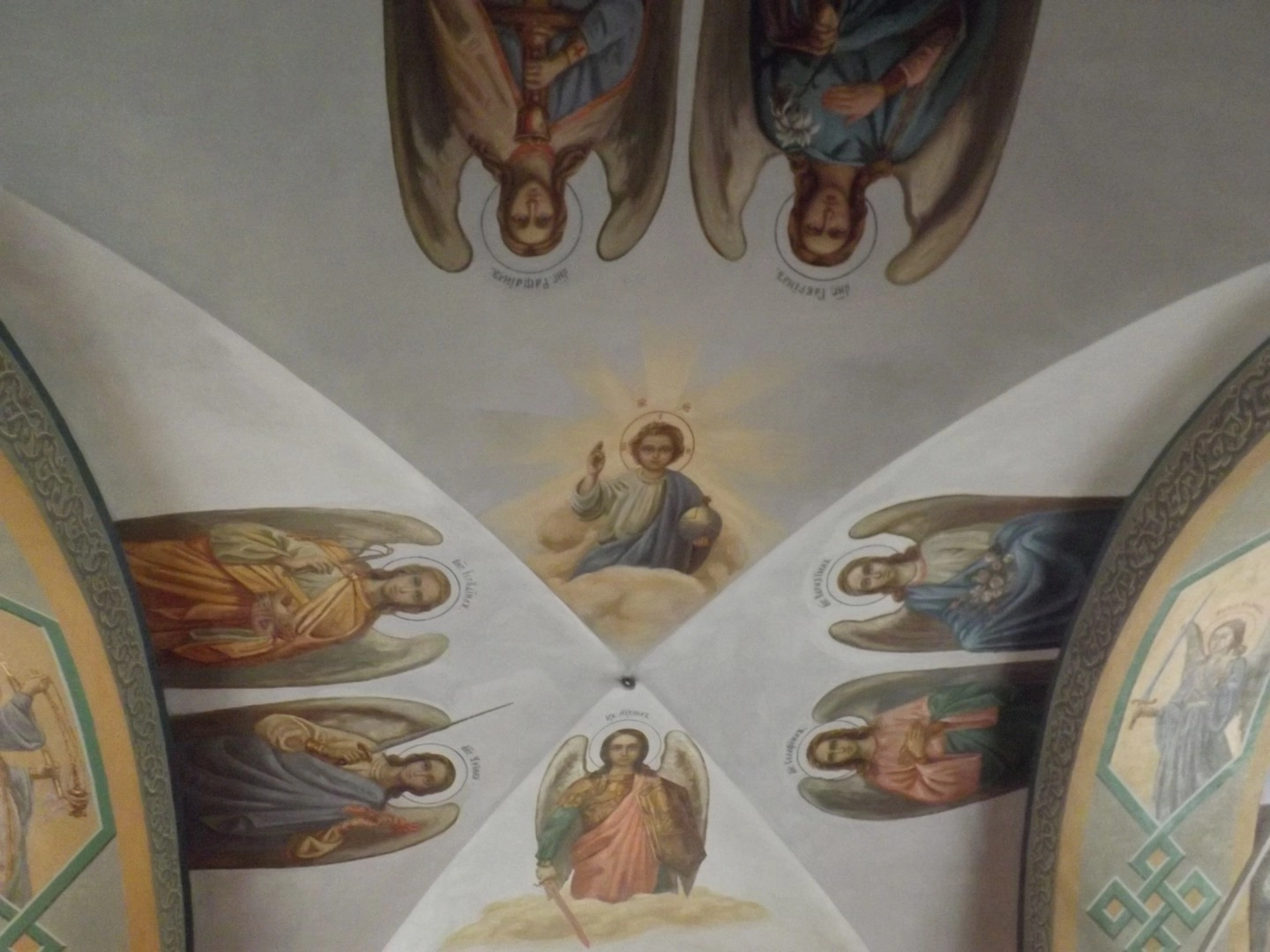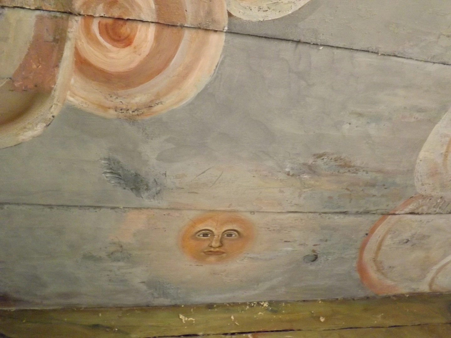Ещё можно заехать в Ботанический сад — и обнаружить в тамошней часовенке такое вот солнышко. На потолке оно встречается с луною — которая на фотографию, к сожалению, не влезла.