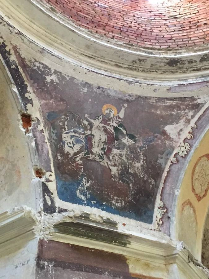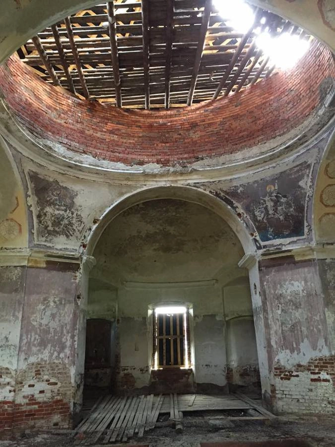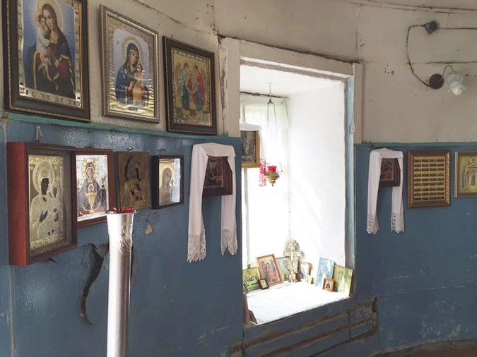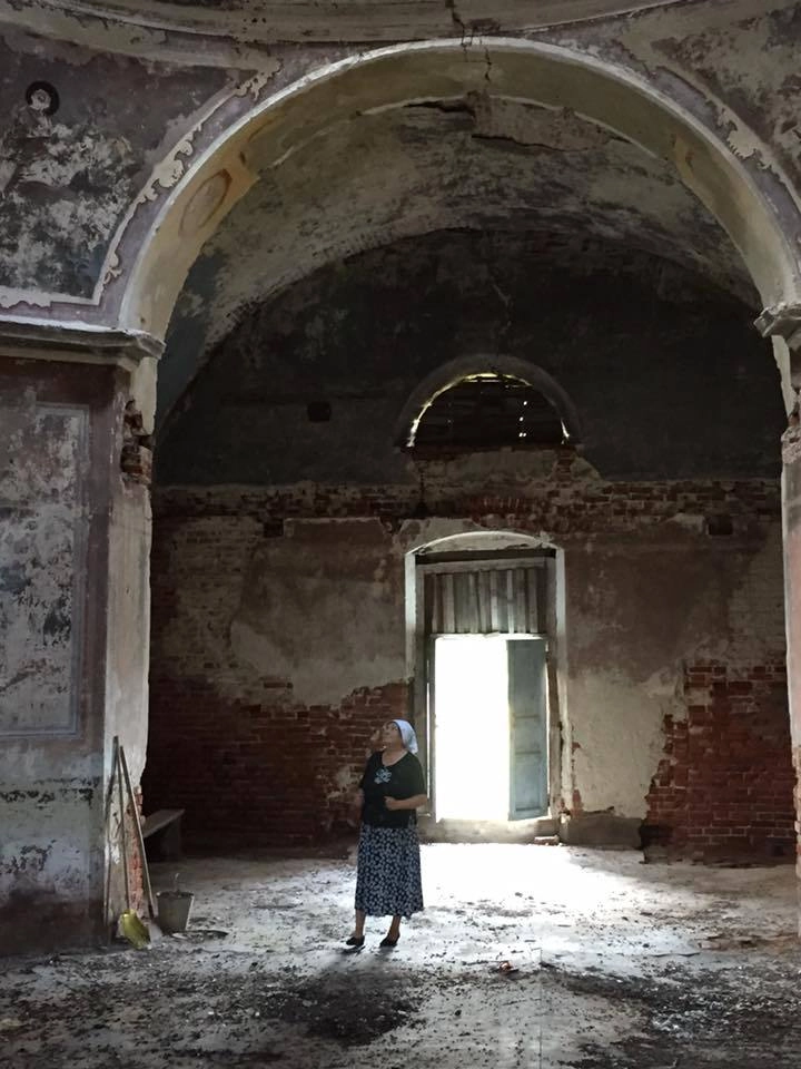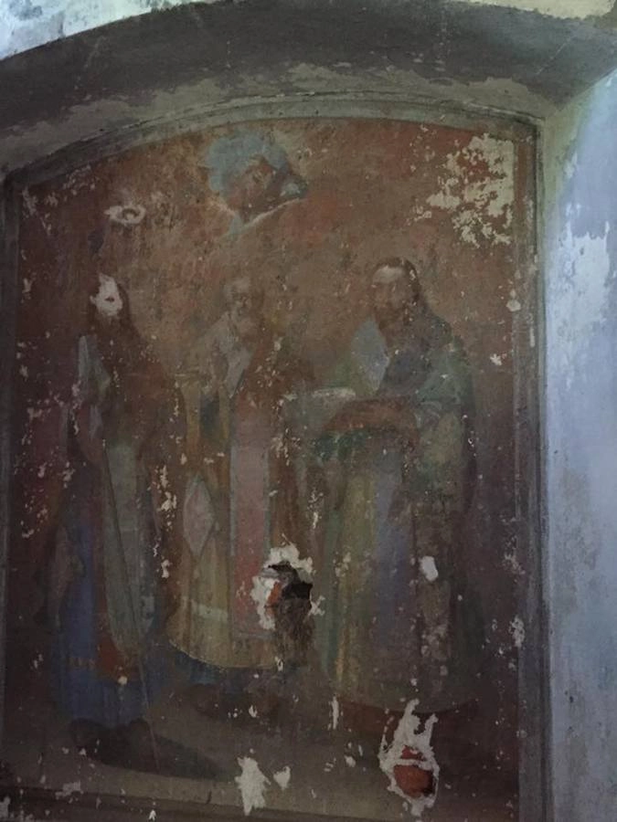 Повела меня сквозь бурьяны к более позднему храму. Он запущен, пол в следах птичьего помета, но на стенах проступают красивые росписи с ликами святых. Денег здесь восстановить храм ни у кого нет, говорит Татьяна, и опять, но теперь грустно, улыбается. «Вы уж там напишите в интернете про наши церковки, может найдется, кто поможет», — говорит она мне, и уже по-доброму улыбается. Пишу, теть Таня, пишу; обязательно поможем…