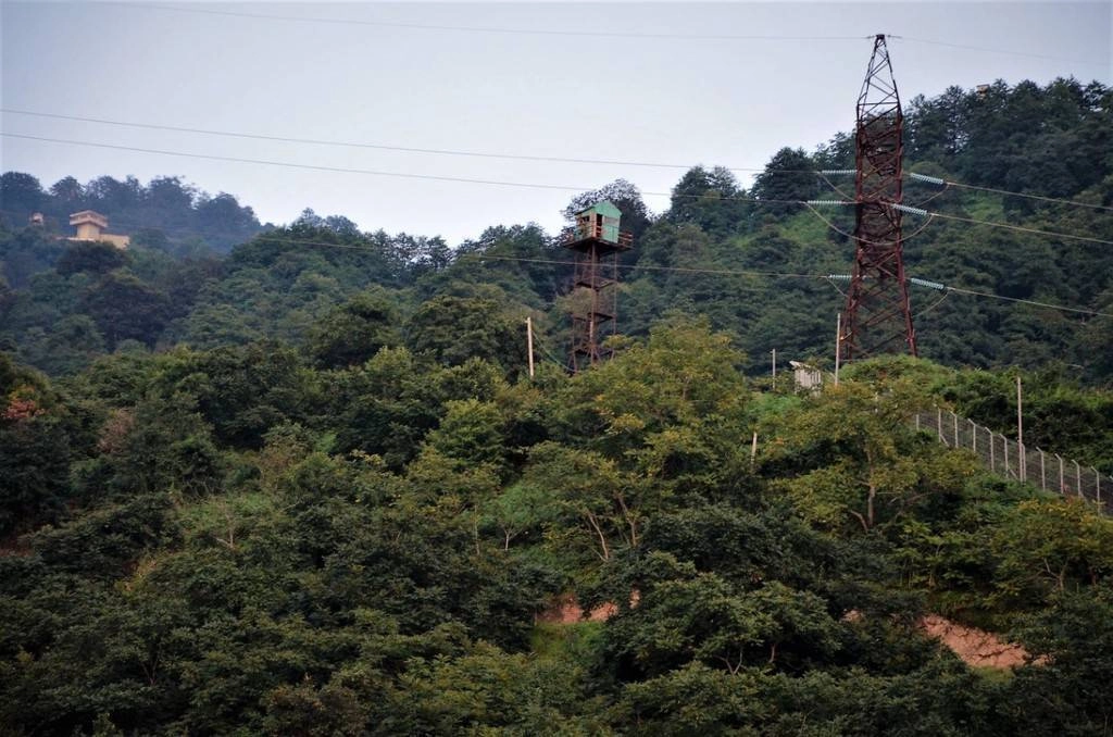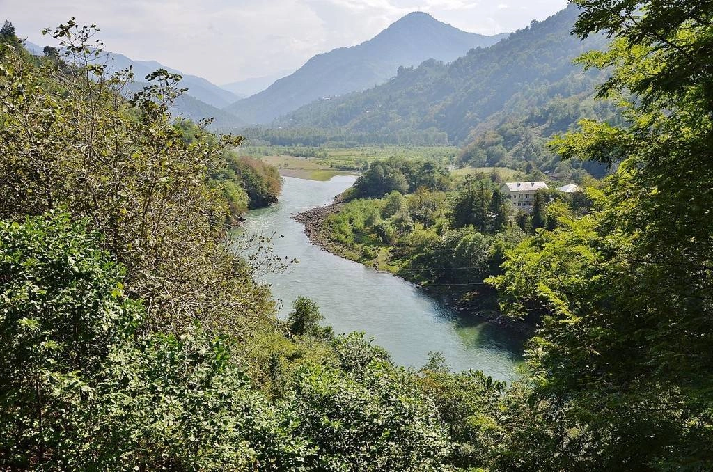 По дороге заехали к развалинам крепости в районе поселка Киринати, и там же рядом две большие ГЭС, одна на грузинской стороне, вторая на турецкой, в пятистах метрах от пограничного забора. Но турецкую нам увидеть не удалось, пограничники не пропустили, типа пограничная зона. Это здесь находится по Google Maps. На данной же фотографии Турция виднеется за излучиной Чороха, прямо по курсу, от того домика на берегу до забора будет пятьсот метров от силы.