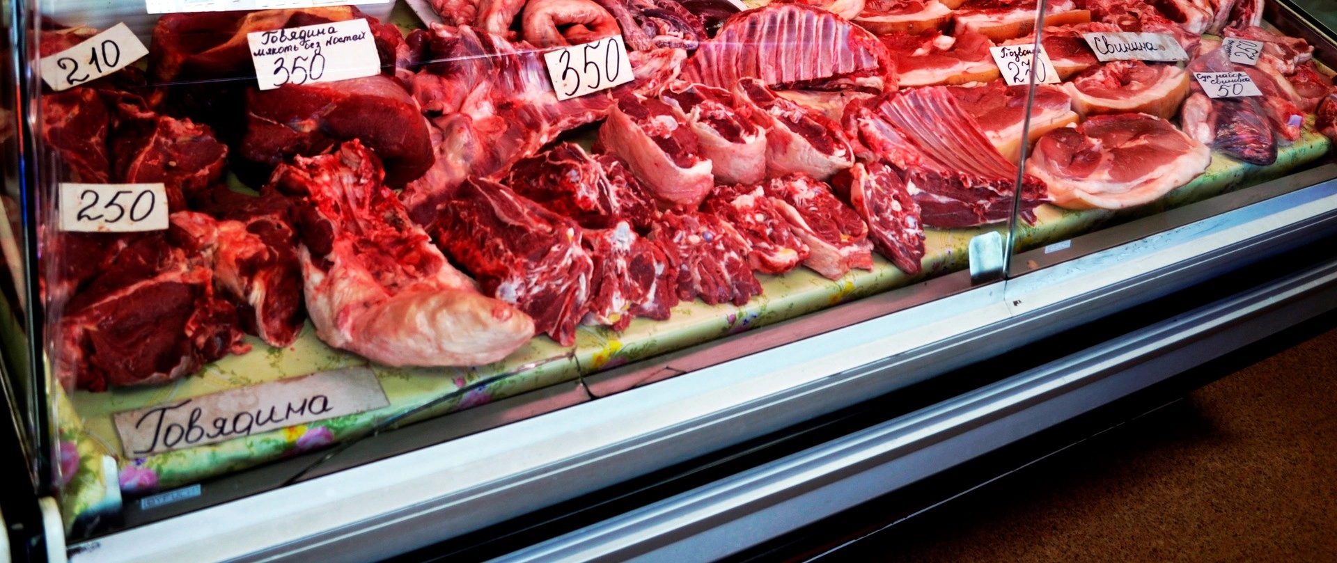 Витрина небольшой мясной лавки на первом этаже дома, где автор жил четыре месяца. Это розничный магазин. На рынке цены на порядок ниже