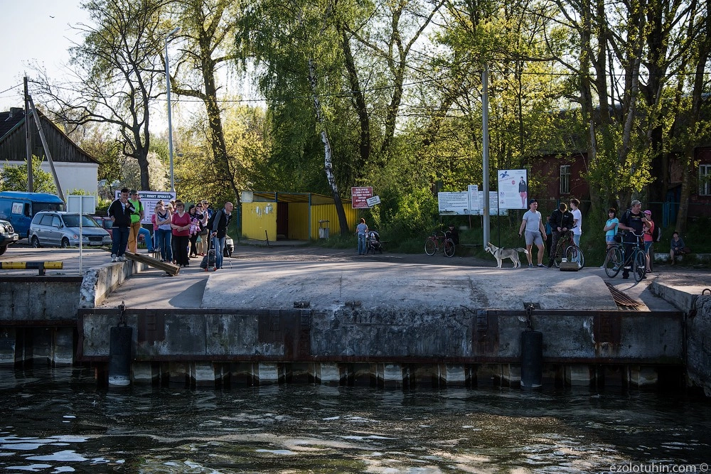 Вид на причал на косе с парома. Здесь есть два поселка, оба на самом краю косы, несколько сотен живущих здесь людей ежедневно переправляются на работу, в магазин, в школу, больницу в Балтийск, а потом обратно. Ничего из вышеперечисленного на косе нет.