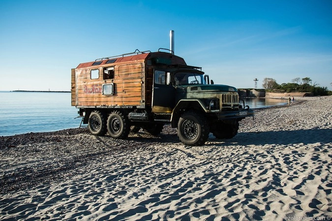 Несмотря на то, что на песок запрещен въезд любого транспорта, какие-то умники пригнали сюда огромный ЗИЛ, внутри которого устроили баню.