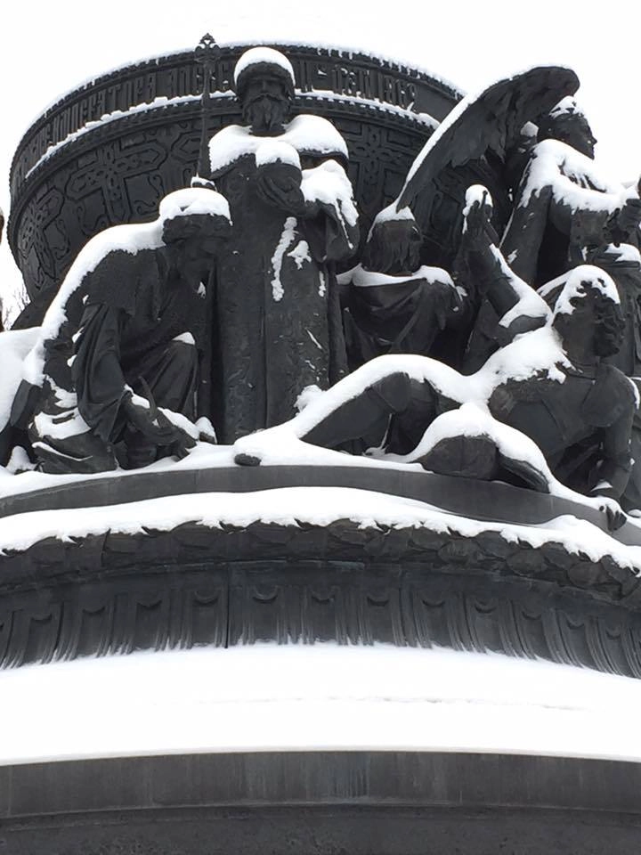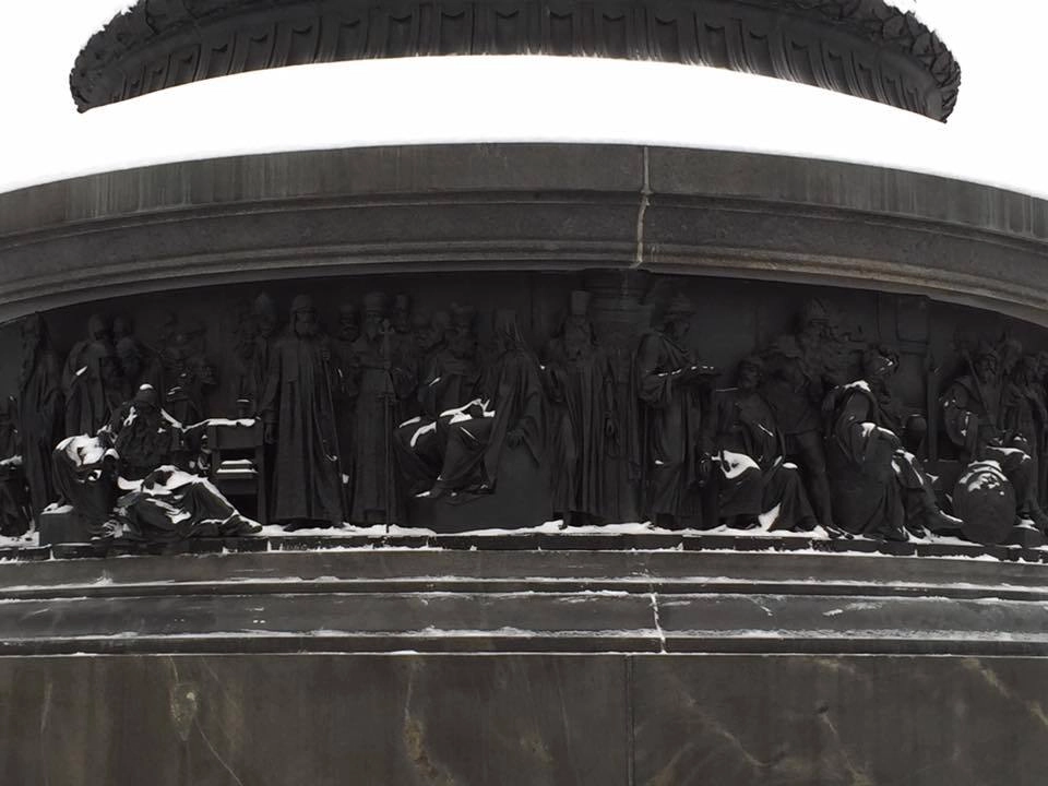 Походить и пофоткаться, это одно, а вот поизучать исторические фигуры, изображенные на памятнике, это очень интересный аспект. Да, на памятнике отображены очень многие исторические персоны — князья, цари, крестители, священники, ученые, художники, полководцы, писатели и поэты. Но есть и некоторые исторические нелепицы, точнее, несправедливицы. Среди государственных деятелей отсутствует изображение Ивана Грозного, хотя присутствуют трое его приближенных: первая жена Анастасия Романова, Адашев, протопоп Сильвестр. Отсутствует император Павел Первый, но это понятно — не любили его, хотя история государства без него тоже не история. Николай I добавлен в последний момент.
