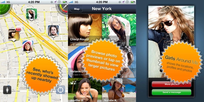 Программа Girls Around Me собирала, анализировала и размещала на карте данные о "чек-инах" в Foursquare, транслировавшихся пользователями на их страницы в Facebook. Приложение обозначало координаты человека на месте последнего "чек-ина" иконкой с его фотографией, взятой из его аккаунта в социальной сети.