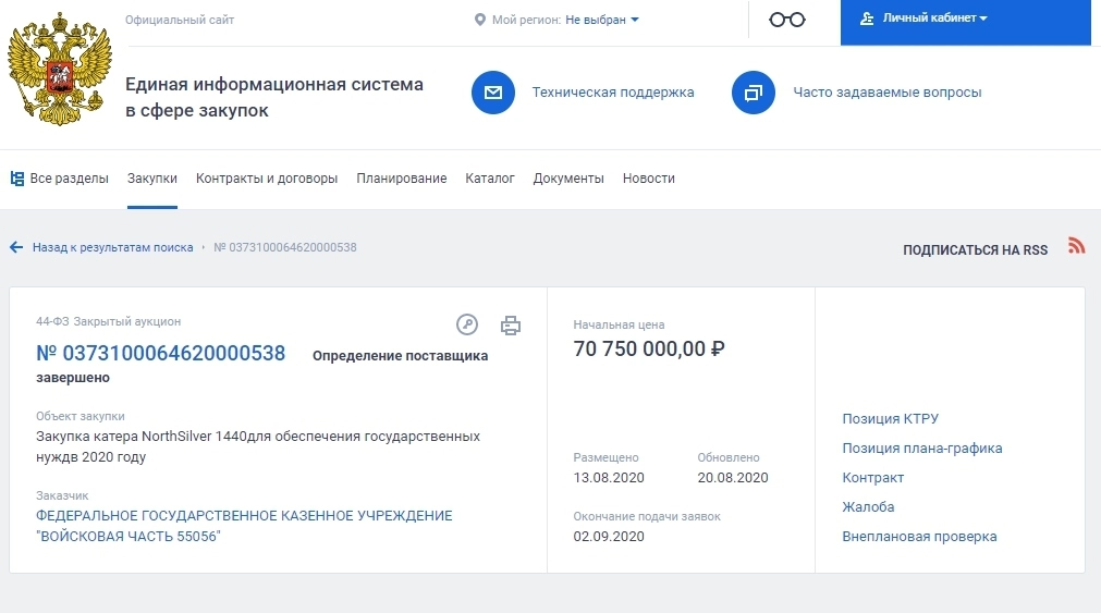 Аукцион проходил в закрытом режиме, поэтому техническое задание и обоснование закупки в тендере отсутствуют. Там лишь сказано, что экспедиционная яхта необходима для «обеспечения государственных нужд в 2020 году».