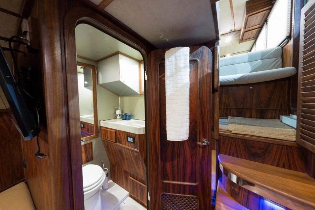 Судно может принять на борт до десяти человек. На яхте есть две каюты на шесть спальных мест, электрическая плита, мойка для рук, холодильник, ящики для посуды и мелочей, душевая кабина, два гальюна (туалета), аудиосистема.