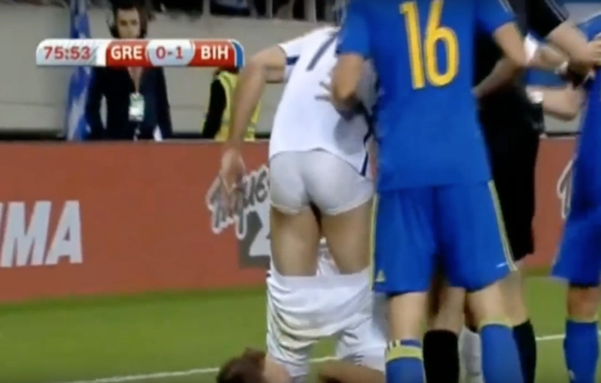 Форвард сборной Боснии и Герцеговины Эдин Джеко сорвал трусы с защитника команды Греции Сократиса Папастатопулоса во время матча в рамках квалификации ЧМ-2018.