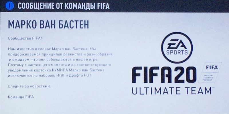 Нам известно о словах Марко ван Бастена. Мы придерживаемся принципов равенства и разнообразия и ожидаем, что они соблюдаются в нашей игре. Поэтому с настоящего момента и до соответствующего уведомления карточка «Кумира» Марко ван Бастена исключается из наборов, ИПК и Драфта FUT.