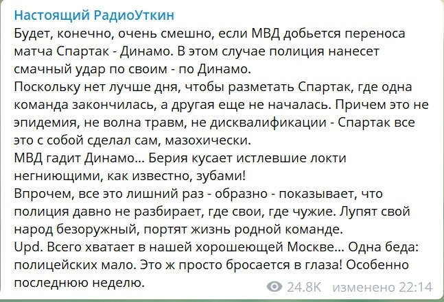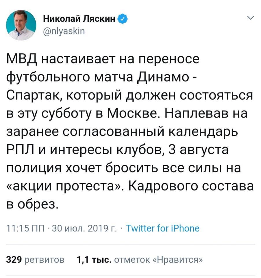 Во вторник, 30 июля, сотрудник ФБК Николай Ляскин написал в Twitter, что МВД обратилось в РПЛ с просьбой о переносе старейшего футбольного дерби страны на другой день. Причина — несанкционированный митинг, дескать, неудобно полиции гонять оппозиционеров и сдерживать футбольных фанатов в один день. Рук не хватает.