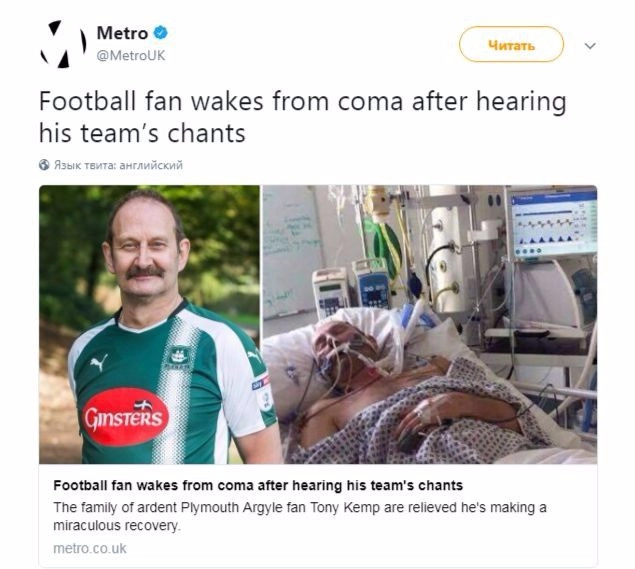 Медики уже собирались отключать от системы жизнеобеспечения находящегося в коме 59-летнего пациента, когда его родные предприняли отчаянную попытку привести его в сознание. Жена Кемпа включила записи кричалок любимой футбольной команды мужа «Плимут Аргайл». Вскоре после этого Тони открыл глаза, сообщает Metro.