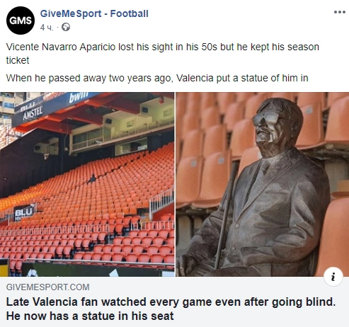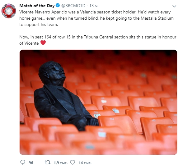 Испанский футбольный клуб «Валенсия» установил на трибуне домашнего стадиона «Месталья» статую своего преданного болельщика Висенте Наварро Апарисио, сообщает Givemesport.