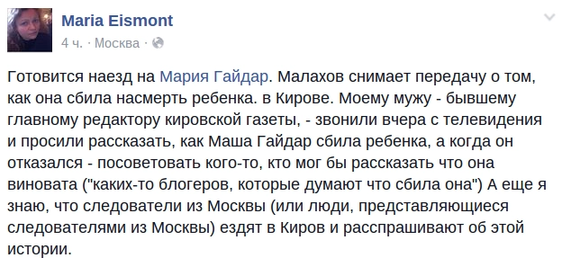 Тогда в блогосфере стали появляться сообщения о том, что экс-вице-губернатор Кировской области Мария Гайдар, возможно, замешанная в коррупционном скандале, оставила свой пост и уехала в Гарвард, скрываясь от неудобных вопросов следствия. «Ее сбил не троллейбус, а серый джип, — писали кировчане. — Кто в Гарвард сваливает — вот тот и сбил».