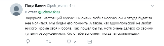 «Уход Задорнова и его смерть — это замечательный урок для всех нас. Потому что после того, как человек уходит (ведь ему никто не запрещал выступать), наступает гамбургский счет. Когда подведена черта… О том, что он весьма странную тему взял для себя — тема называлась „ну, тупые“, — по сути, Задорнов еще старых времен — предтеча Соловьева и Киселева. По сути, то, что мы сейчас видим в аналитических программах, — это „задорновщина“».