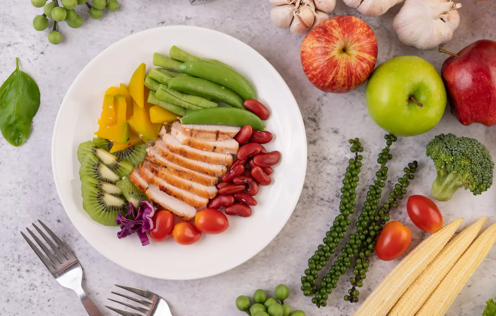 Под овощи и фрукты отводится целых 50% площади (рекомендуемый диаметр тарелки — 22 сантиметра для женщин и 24 сантиметра для мужчин). При этом акцент следует делать именно на разнообразных овощах, особенно некрахмалистых. Фрукты рассматриваются как важное, но дополнительное, а не основное наполнение этой половины.