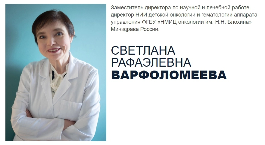 Согласно информации на сайте НМИЦ имени Блохина, Светлана Рафаэлевна Варфоломеева получила должность должность заместителя директора по научной и лечебной работе — директором НИИ детской онкологии и гематологии аппарата управления онкоцента 4 июня 2019 года. В ее краткой биографии сказано, что она окончила педиатрический факультет ФГБОУ «Российского национального исследовательского медицинского университета имени Н. И. Пирогова» в 1996 году.