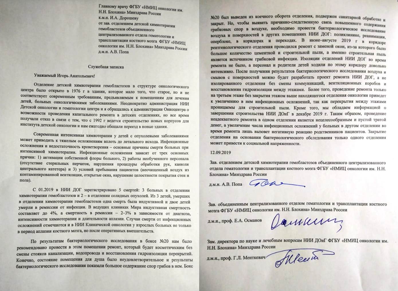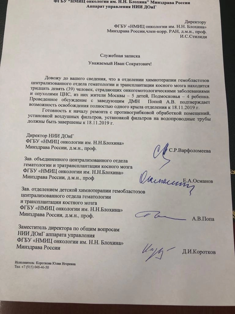 После публикации этой статьи из НМИЦ имени Блохина прислали фотографию приказа о приостановлении госпитализации первичных пациентов. Однако в документе написано: «Служебная записка».