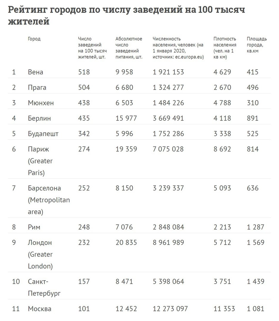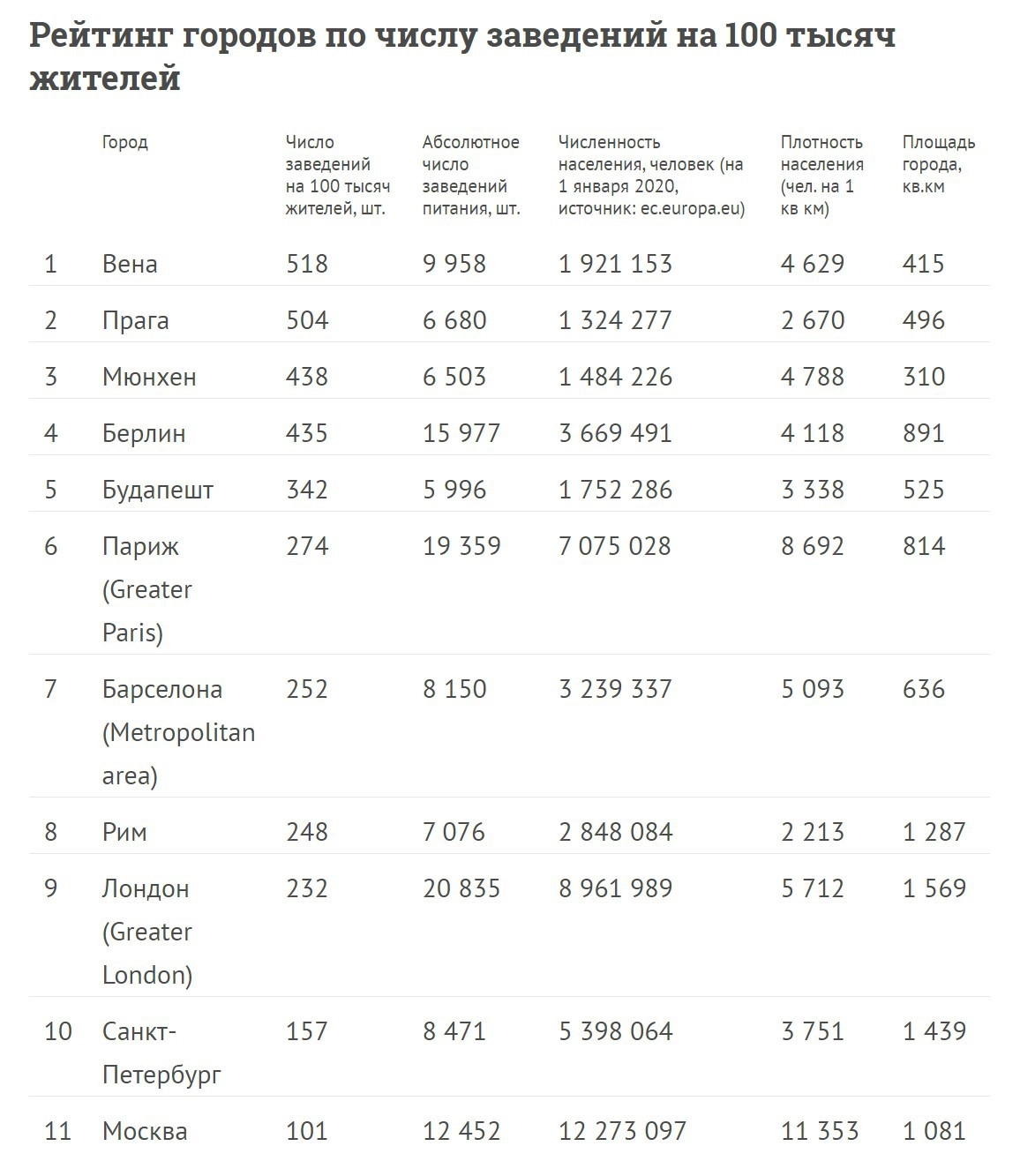 Интересно, что по абсолютному числу заведений питания с большим отрывом лидирует Лондон: там насчитывается почти 21 тысяча кафе, ресторанов, баров, пабов, заведений фастфуда и фудкортов. Однако численность его населения в 4,7 раз превышает показатель лидера рейтинга Вены и из городов списка уступает только Москве, а площадь британской столицы и вовсе является самой большой среди исследуемых городов. Поэтому по показателям обеспеченности заведениями на человека Лондон не занимает высоких позиций.