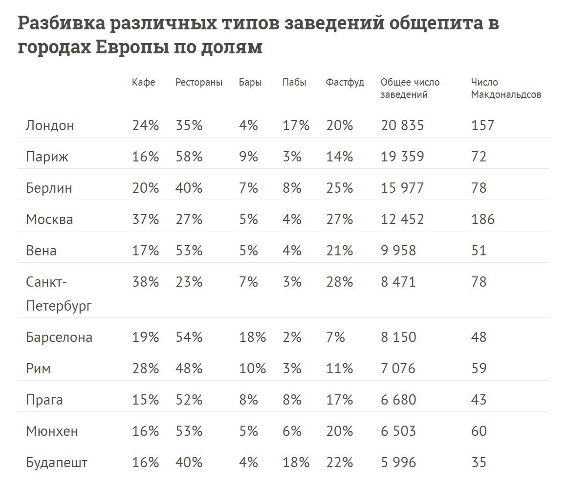 Что касается различий в структуре заведений питания, больше половины заведений Парижа, Вены, Барселоны, Праги и Мюнхена занимают рестораны, а российские города отличились самой большой долей фастфуда.
