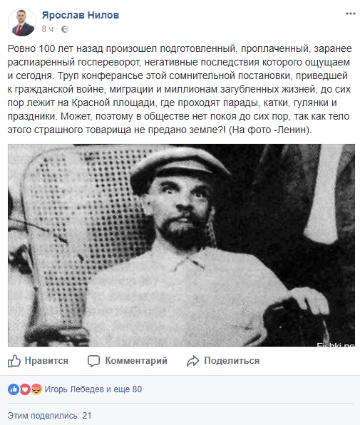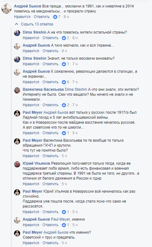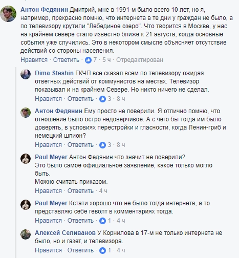 Смысл отмечать 7 ноября, пусть даже и открыточками в ФБ, если в августе 1991 года на защиту идеалов и завоеваний Революции не встал ни один коммунист «с улицы»? Иногда сталкиваешься в камментах с такими персонажами, они обычно боевые «коньки-горбунки» — визжат, показывают дули, кроют там «попов» или «Николашку Кровавого с царицей-немкой». А спросишь его так в лоб: «Где был в августе 1991 года?». Интернет-коммунист сразу рвется и говорит так тихо: «На территории воинской части, ждал приказа» или «смотрел телевизор» или «был в момент капиталистического переворота мутной каплей биоматериала,негодует господин Стешин на личной странице в Facebook (пунктуация и орфография сохранены).