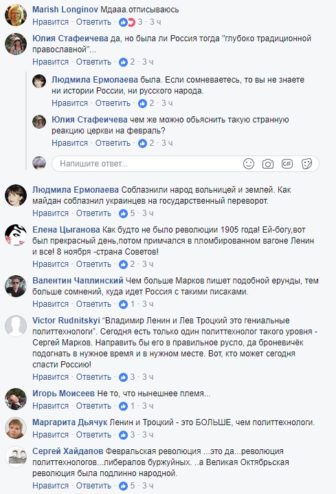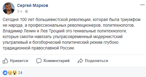 Политолог Сергей Марков обвинил во всех бедах переходного периода 1917 года профессиональных революционеров, а также гениальных политтехнологов Владимира Ленина и Льва Троцкого. Последние, по мнению Маркова, навязали «глубоко традиционной православной России ультрасовременный модернистский ультралевый и богоборческий политический режим».