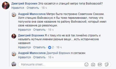«Лично я не против, если памятью об ушедшей эпохе будут названия тех улиц, которые были построены именно в ту эпоху и были названы в честь значимых личностей эпохи именно в тот момент. Но всем старым улицам должны быть возвращены свои исконные названия», — пояснил Малосолов.