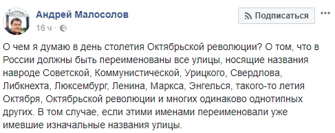 Спортивный журналист, ведущий телепрограммы Фанзона Андрей Малосолов призвал в годовщину Октябрьской революции переименовать все «старые» улицы, имеющие названия советского периода.