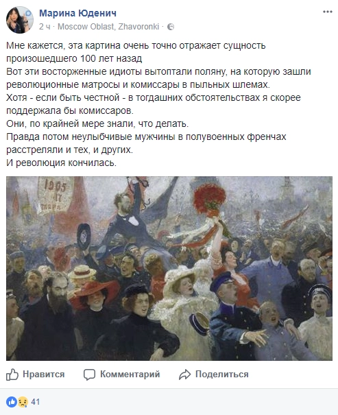 Не осталась в стороне и публицист Марина Юденич. На её взгляд, главной причиной прихода большевиков к власти стали какие-то «восторженные идиоты, которые вытоптали поляну для революционных матросов и комиссаров в пыльных шлемах».