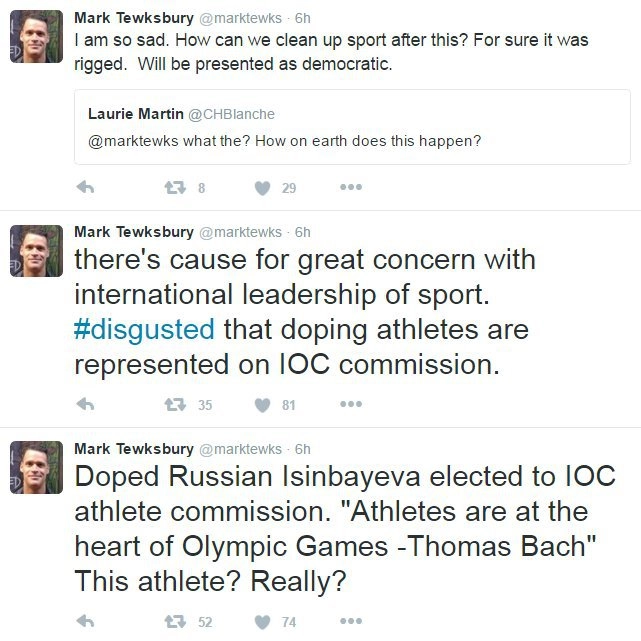 «Принимавшая допинг Исинбаева избрана в комиссию спортсменов МОК. Эта спортсменка? Серьезно? Я переживаю за руководство мирового спорта. Отвратительно, что спортсмены, употреблявшие допинг, представлены в комиссии», — написал Тьюксбери в Twitter.