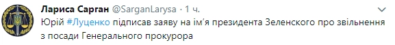 «Юрий Луценко подписал заявление на имя президента Зеленского об освобождении от должности генерального прокурора», — поместила пресс-секретарь пост в своем микроблоге в Twitter.