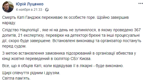 С целью установления заказчика подозреваемый в организации убийства в конце октября переведен в изолятор СБУ Киева. Все, что я обещал Кате, когда посещал ее в больнице, — будет выполнено. Искренние соболезнования родным и друзьям. Светлая память, — написал Юрий Луценко.