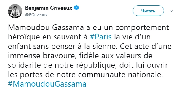 «Мамуду Гассама повел себя как герой. Спасая жизнь ребенка в Париже, он совсем не думал о своей. Проявленные им храбрость и верность ценностям нашей республики должны распахнуть перед ним двери нашего национального сообщества», — написал Гриво.