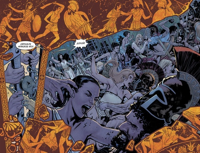 Реальность оказалась и того хуже. Диана с ужасом выясняет, что в «безумном мужском мире женщины порабощены, сломлены и искалечены», «трясутся перед щенком-мужчиной» и умирают, зачастую — «одни, в страхе». Разумеется, теперь она уверена, что «мир мужчин должен смиренно покориться милостивой власти Чудо-Женщин Амазонии», — и хорошо бы, если б все признали их «любящую власть», надев на шеи ошейники.