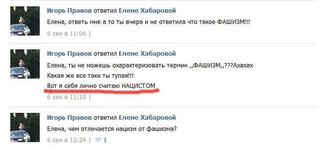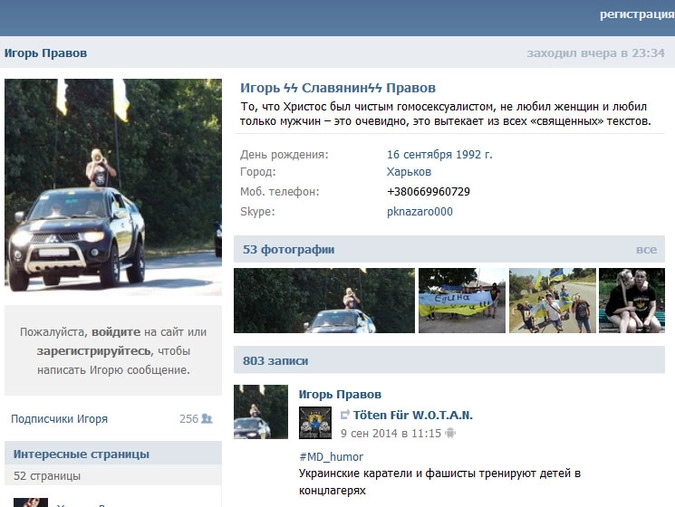 Очень скоро добровольные сыщики наткнулись на аккаунт Вконтакте, который их чрезвычайно заинтересовал: https://vk.com/id65905923. Он принадлежит некоему Игорю Правову, которому 16 сентября должен исполниться 21 год (реальный год рождения не соответствует указанному на странице Вконтакте). Как установили блогеры, имя у владельца аккаунта на самом деле Игорь, а вот фамилия другая, но и она уже известна. Игорь совсем открыто исповедует нацистскую идеологию, а убедиться в этом вы можете подробней ознакомившись с его страничкой.