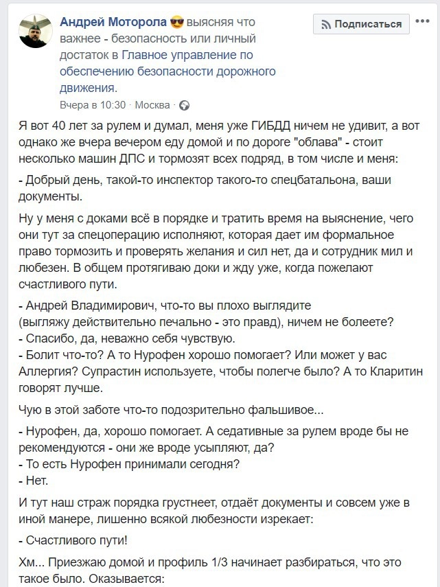 На повышенный интерес сотрудников ГИБДД к употреблению лекарств автомобилистами пожаловался пользователь Facebook Андрей Моторола.