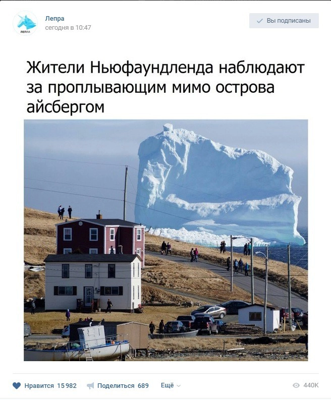 На днях у рыбацкой деревни появился невероятно гигантский айсберг, шокировавший даже местных жителей. Ледяная глыба в 50 раз больше той, из-за которой потонул легендарный «Титаник». Сотни приехавших на остров туристов фотографируют невероятное зрелище и публикуют свои снимки в Инстаграм.