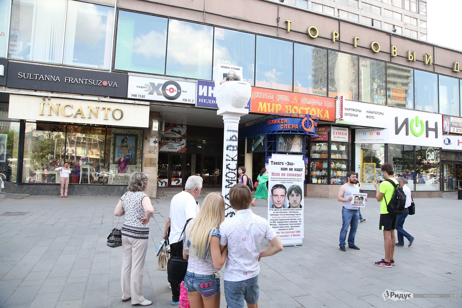 Также рядом со скульптурой стоял молодой человек с плакатом в руках. На плакате были размещены фото задержанных на Украине журналистов телеканала Лайф Ньюз Олега Сидякина и Марата Сайченко с подписью: «#SaveOursGuys».