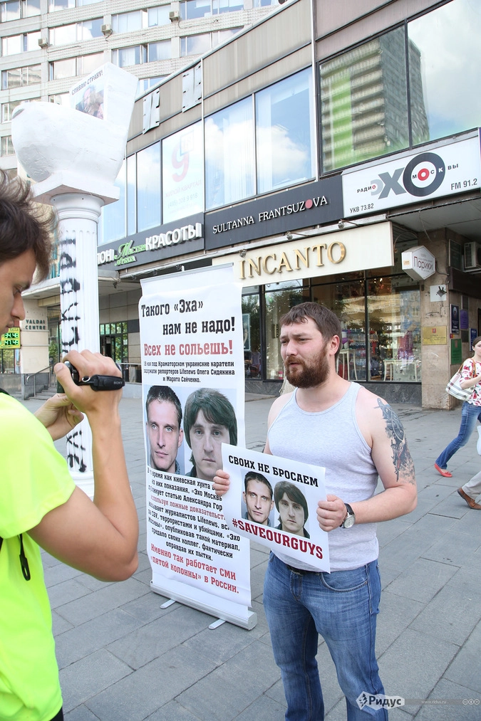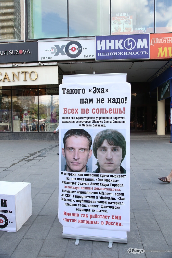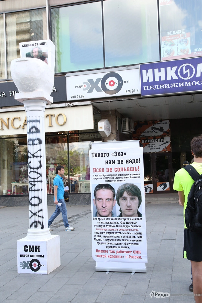 «"Эхо Москвы", опубликовав такой материал, предало своих коллег, фактически оправдав их пытки. Именно так работает СМИ "пятой колонны" в России», - пояснил суть акции ее участник, представившийсяВалерием Ильиным.