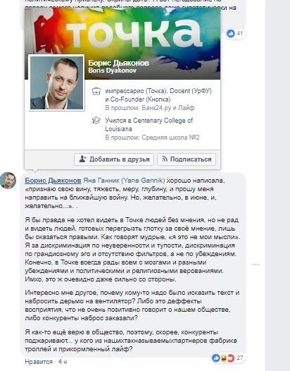 Дьяконов, желая защитить свою подчиненную Ганник от нападок, заявил, что и он «не рад видеть в „Точке“ людей, готовых перегрызть глотку за свое мнение, лишь бы оказаться правыми».