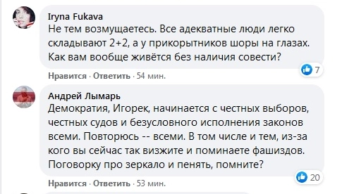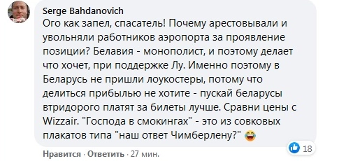 В комментариях гендиректору «Белавиа» советуют освежить в памяти определение термина «фашизм» и напоминают о случаях беззакония в отношении журналистов и обычных жителей, выходивших прошлой осенью протестовать против режима Лукашенко.