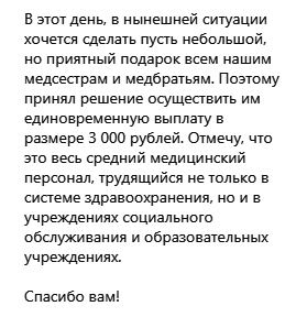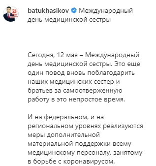 В этот день, в нынешней ситуации хочется сделать пусть небольшой, но приятный подарок всем нашим медсестрам и медбратьям. Поэтому принял решение осуществить им единовременную выплату в размере трех тысяч рублей. Отмечу, что это весь средний медицинский персонал, трудящийся не только в системе здравоохранения, но и в учреждениях социального обслуживания и образовательных учреждениях, — написал глава республики в своем Instagram-аккаунте.