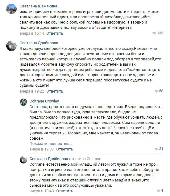 «Компьютерные игры тоже влияют — учат стрелять. Это действует на психику, особенно когда человек тихоня, неустойчив. Обвинять офицеров в том, что они довели этого рядового бойца до расстрела своих сослуживцев, — это категорически неправильно», — с таким мнением выступила Салихова на пресс-конференции.