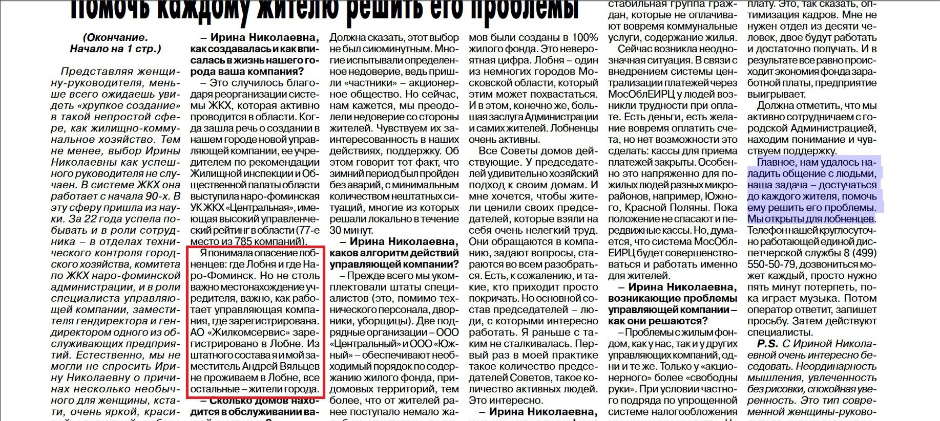 Забавно, но в апрельском номере газеты «Лобня» за 2016 год опубликовано интервью генерального директора АО «Жилкомсервис» Ирины Загуляевой. В нем она прямым текстом сообщает, что Андрей Вяльцев — ее заместитель, причем «из штатного состава я и мой заместитель Андрей Вяльцев не проживаем в Лобне, все остальные — жители города».